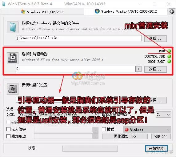 引导分区的意思就是我们windows要启动先要引导,引导信息一般都存放在分区中,通常情况下,普通安装的windows系统引导信息都存放在系统分区,也就是我们俗称的c盘,但是uefi安装就不一样,引导会存放在esp分区,这个我们要灵活选择。至于是普通安装还是uefi安装,nt都会有提示